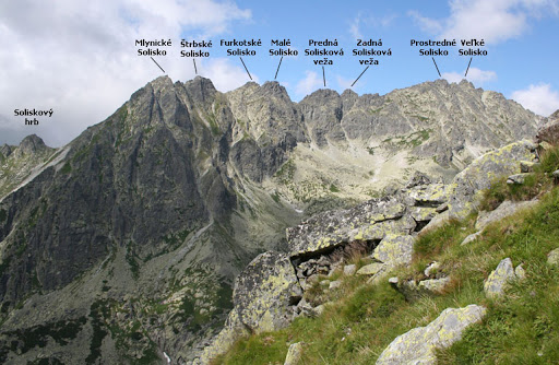 Soliskový hrebeň vybieha z Furkotského štítu, má dĺžku 4 km a tvorí ho 7 štítov - Veľké Solisko, Prostredné Solisko, Malé Solisko, Furkotské Solisko, Štrbské Solisko, Mlynické Solisko, Predné Solisko (na obrázku postupne zprava doľava, Predné Solisko je vľavo mimo záber).